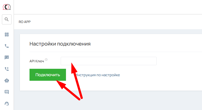 На странице интеграции найдите поле «API ключ» и вставьте скопированный API ключ. Нажмите кнопку «Подключить».