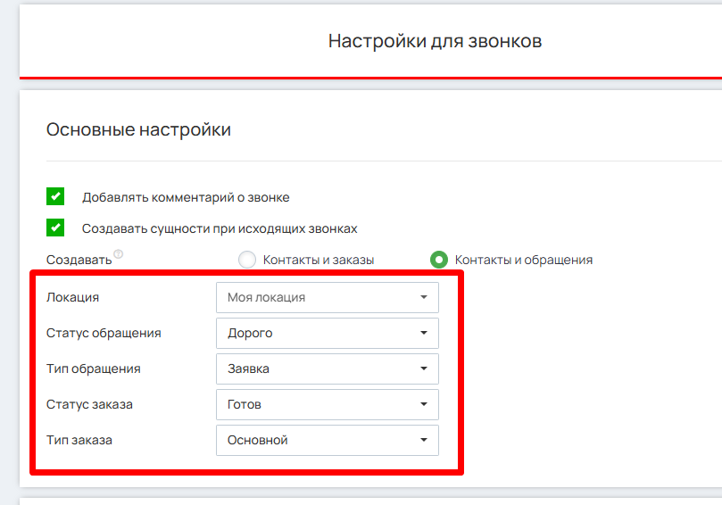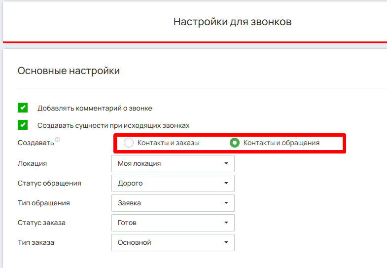 Для настройки раздела звонков выберите одну из предложенных опций: «Контакты и заказы» или «Контакты и обращения».