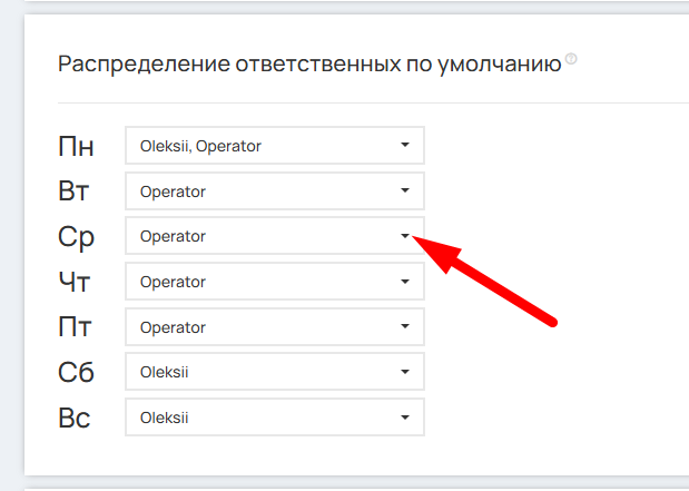 В разделе «Распределение ответственных по умолчанию» можете указать данные ответственного менеджера (или нескольких) для пропущенных звонков. Можно назначить разных ответственных в разные дни недели.