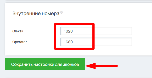 В разделе «Внутренние номера» укажите телефонные внутренние номера своих сотрудников. Это позволит переводить звонки на ответственного менеджера. Нажмите кнопку «Сохранить настройки для звонков»