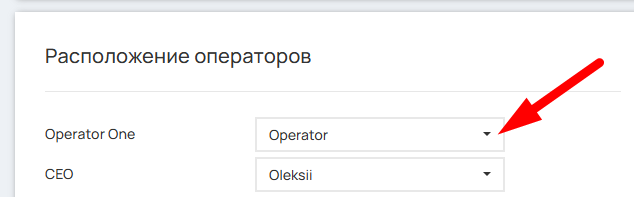 В разделе «Расположение операторов» сопоставьте пользователей проекта в UniTalk (имя слева) с пользователями CRM (выпадающий список справа)