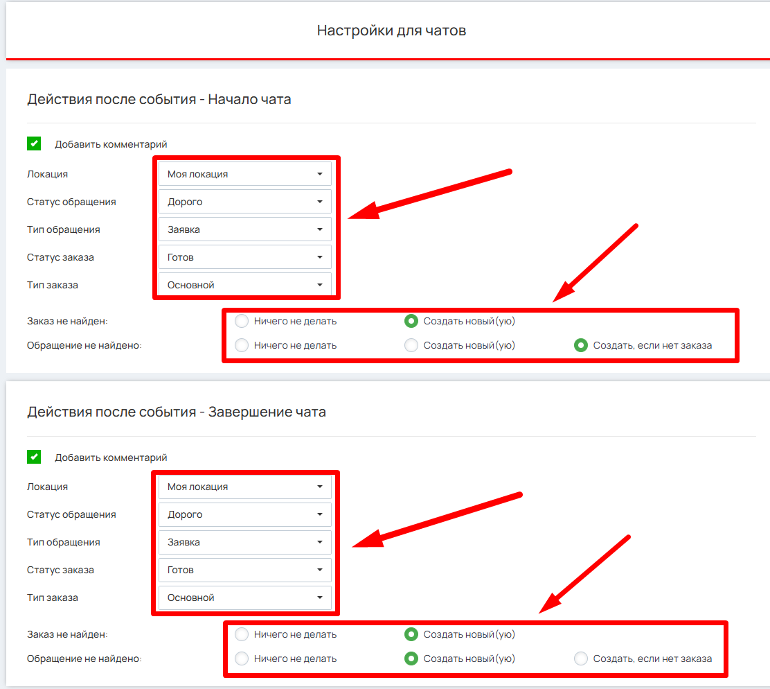 В разделе настроек чатов есть три основных раздела для работы с чатами — «Действие после события — Начало чата», «Действие после события — Завершение чата» и «Действие после события — Обновление полей чата». Для каждого из событий укажите соответствующие настройки создаваемой сущности