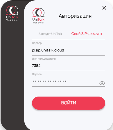 Для использования расширения необходимо авторизоваться, используя учетные данные личного кабинета UniTalk или данные для регистрации SIP-линии.