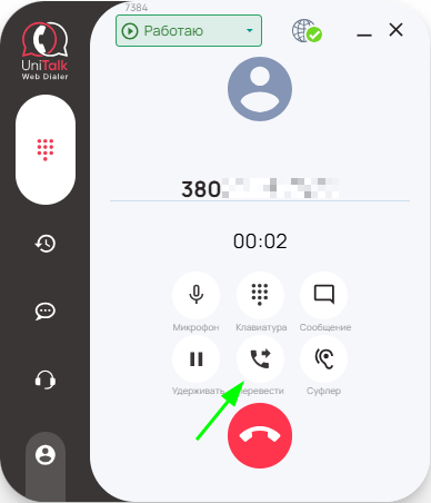 В расширении «UniTalk Web Dialer» есть возможность перевода звонков. Вы можете перевести звонок на другого сотрудника из списка, отдел или ввести номер телефона. Для этого нажмите кнопку «Перевод» в интерфейсе расширения.