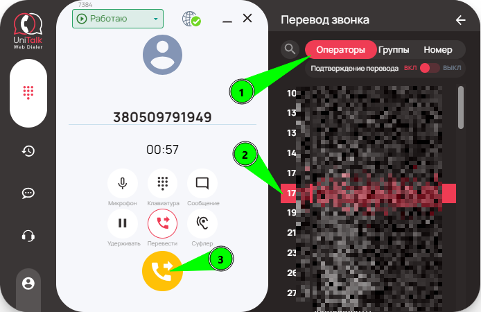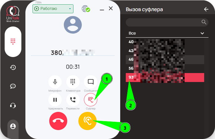 Во время звонка оператор может вызвать суфлера прямо из интерфейса UniTalk Web Dialer. Суфлер — это третий участник разговора, который слышит обе стороны диалога и может давать подсказки оператору, так как клиент не будет слышать суфлера. Чтобы вызвать суфлера из интерфейса UniTalk Web Dialer, сначала нажмите кнопку «Суфлер» (1), затем выберите оператора из списка справа (2) и нажмите кнопку «Вызвать суфлера» (3).