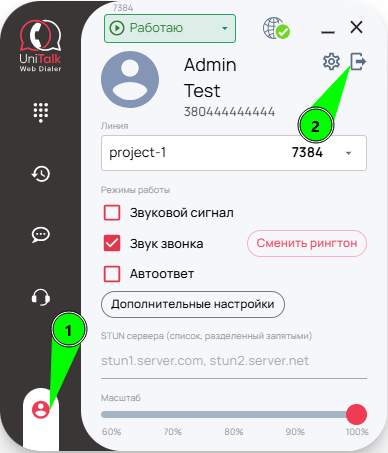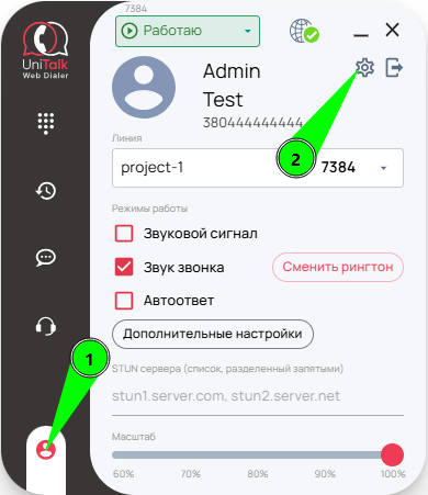Если вы вошли в UniTalk Web Dialer с помощью учетной записи UniTalk, вы можете быстро перейти на страницу своего личного кабинета UniTalk из UniTalk Web Dialer. Для этого сначала перейдите на страницу «Аккаунт и настройки» (1), затем нажмите на кнопку с «шестеренкой» (2).