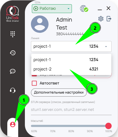 При использовании UniTalk Web Dialer с учетной записью Unitalk вы можете переключаться между SIP-линиями, назначенными вам в разных проектах. Для этого сначала откройте страницу профиля и настроек (1), затем откройте выпадающий список с текущим выбранным проектом и SIP-линией (2) и выберите линию, на которую хотите переключиться (3).