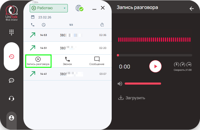 На отдельной вкладке истории звонков в расширении «UniTalk Web Dialer» доступен функционал просмотра, прослушивания звонков, повторного набора и отправки сообщений на номера абонентов, которым звонил оператор (доступно при авторизации с аккаунтом UniTalk).