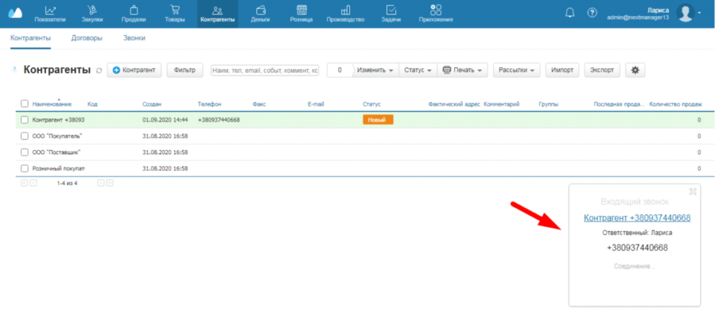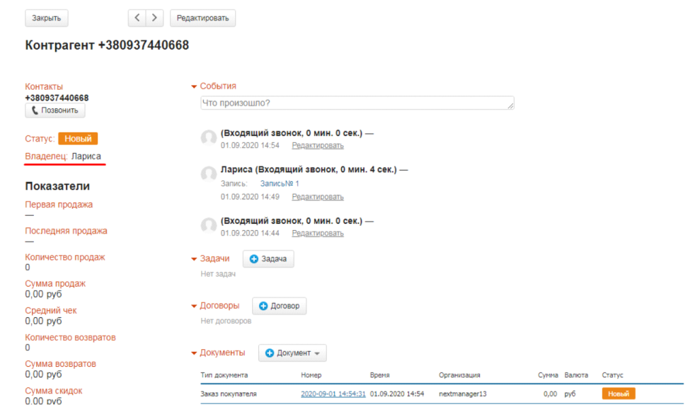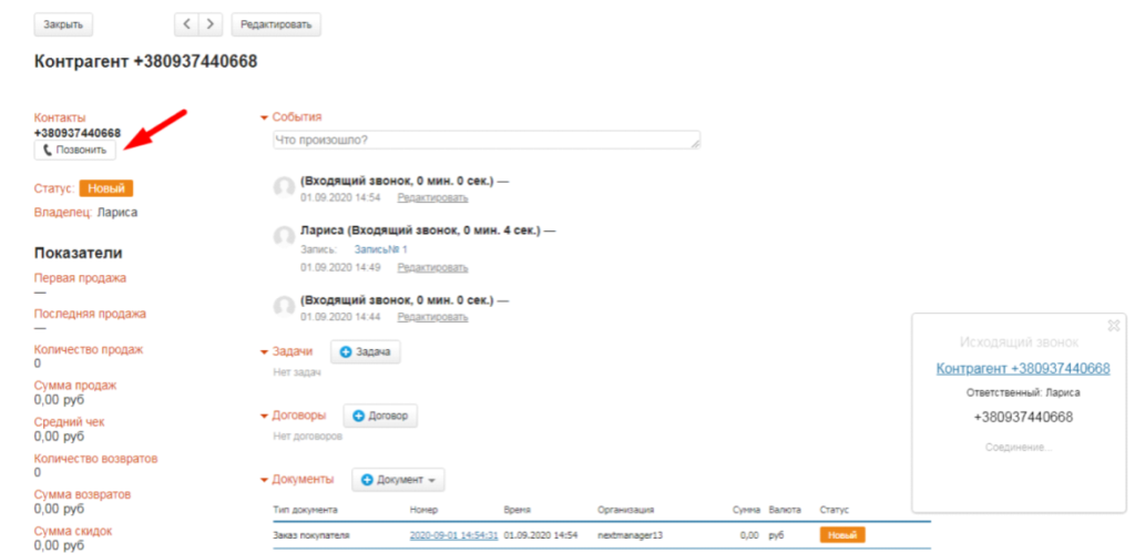Вы можете выбрать организацию, для которой при входящих звонках будут автоматически создаваться новые контрагенты. Если контрагент уже существует, то будет обновляться вся связанная с ним информация о заказах и звонках. Все исходящие звонки также записываются в соответствующие карточки. При этом можно выбрать, как будут создаваться контрагенты – при звонке или при ответе оператора.