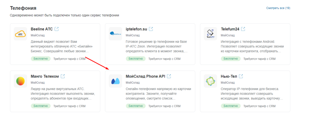 Выбираем приложение «МойСклад Phone API» (это для уведомлений о звонках)