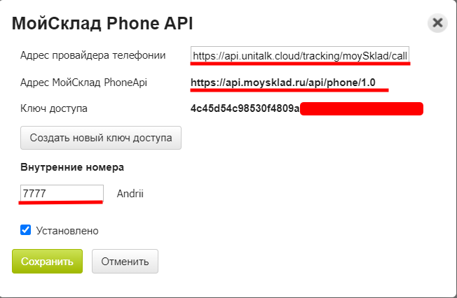 Адрес провайдера телефонии вводим: https://api.unitalk.cloud/tracking/moySklad/callRequest