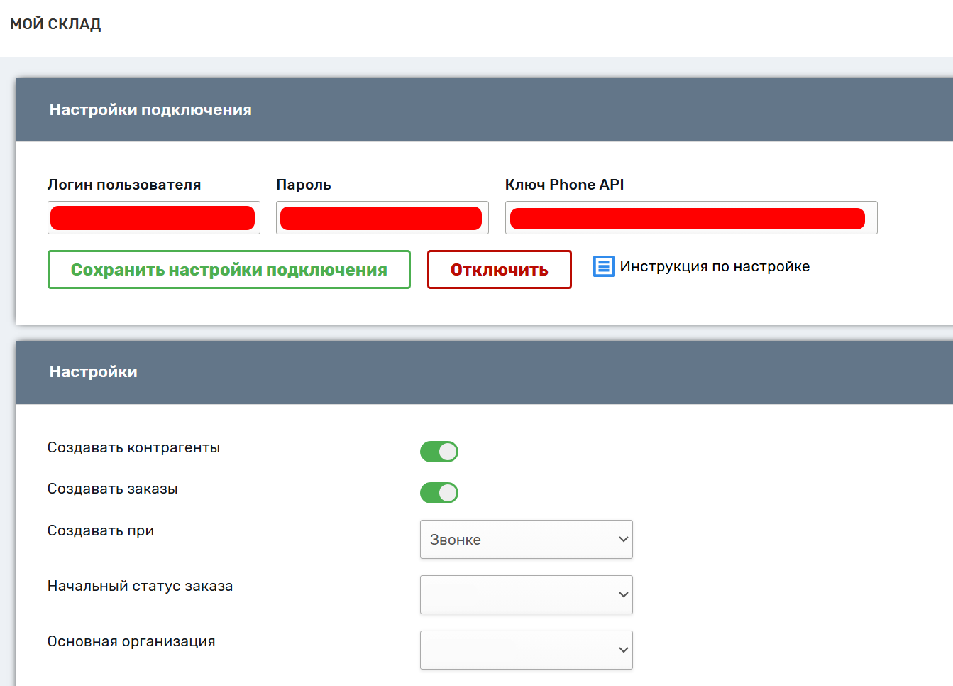 Для работы с контрагентами, заказами и прочими возможностями, также потребуются логин и пароль Вашей учетной записи, используемой для входа в систему «Мой склад».
