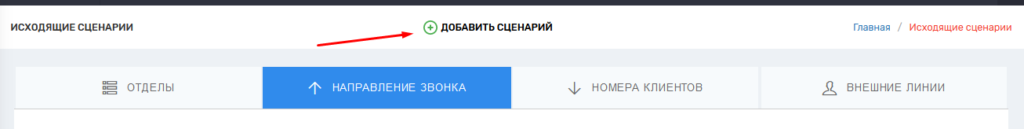 Перейдите в раздел кабинета UniTalk — IP-Телефония — Исходящие сценарии и нажмите кнопку вверху страницы “Добавить сценарий”.