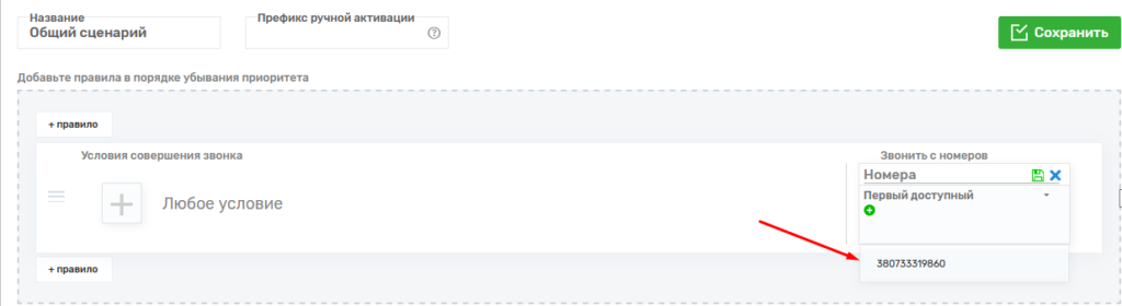 Укажите понятное Вам название. К примеру, “Дозвон” или “Сценарий дозвона”. Выберите тот номер, с которого нужно делать дозвон и сохранить сценарий.
