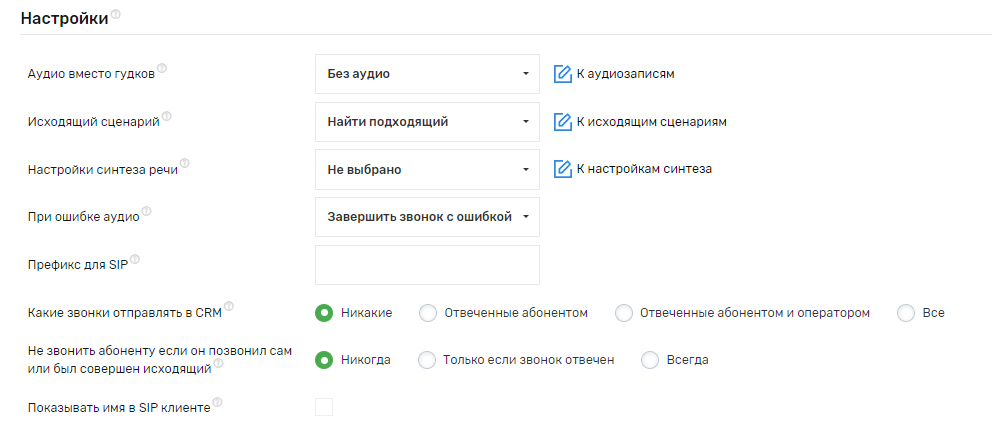 В зависимости от режима дозвона настройки разные, кроме “Названия”, “Аудио вместо гудков”, “Исходящий сценарий”, “Настройки синтеза речи”, “При ошибке аудио”, “Префикс для SIP”, “Отправлять в CRM”, “Показывать имя в SIP клиенте” и “Показывать примечание в SIP клиенте”, — эти настройки общие для всех режимов.