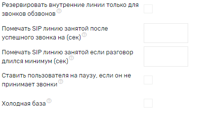 • Помечать SIP линию занятой после успешного звонка на (сек) — небольшая пауза для оператора, после разговора с клиентом, в течении которой линия отмечена «Занятый» и новый звонок поступать не будет.