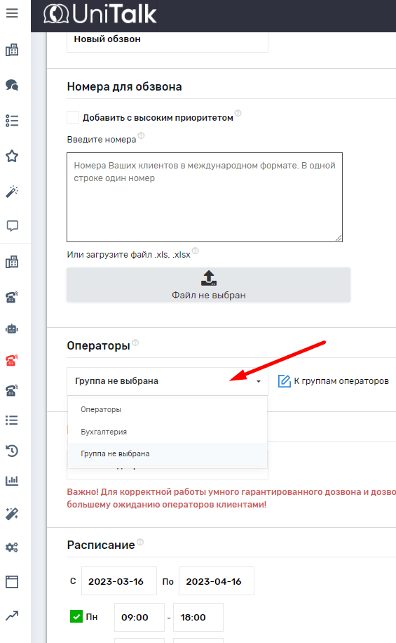 Выберите из списка, ранее созданный отдел сотрудников на которых должны поступать звонки по гарантированному дозвону.