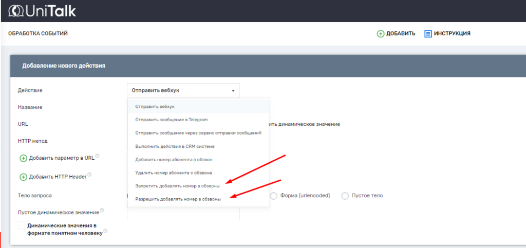 Более детальная настройка действий на странице «Обработка событий». Там же есть инструкция по настройке различных действий.