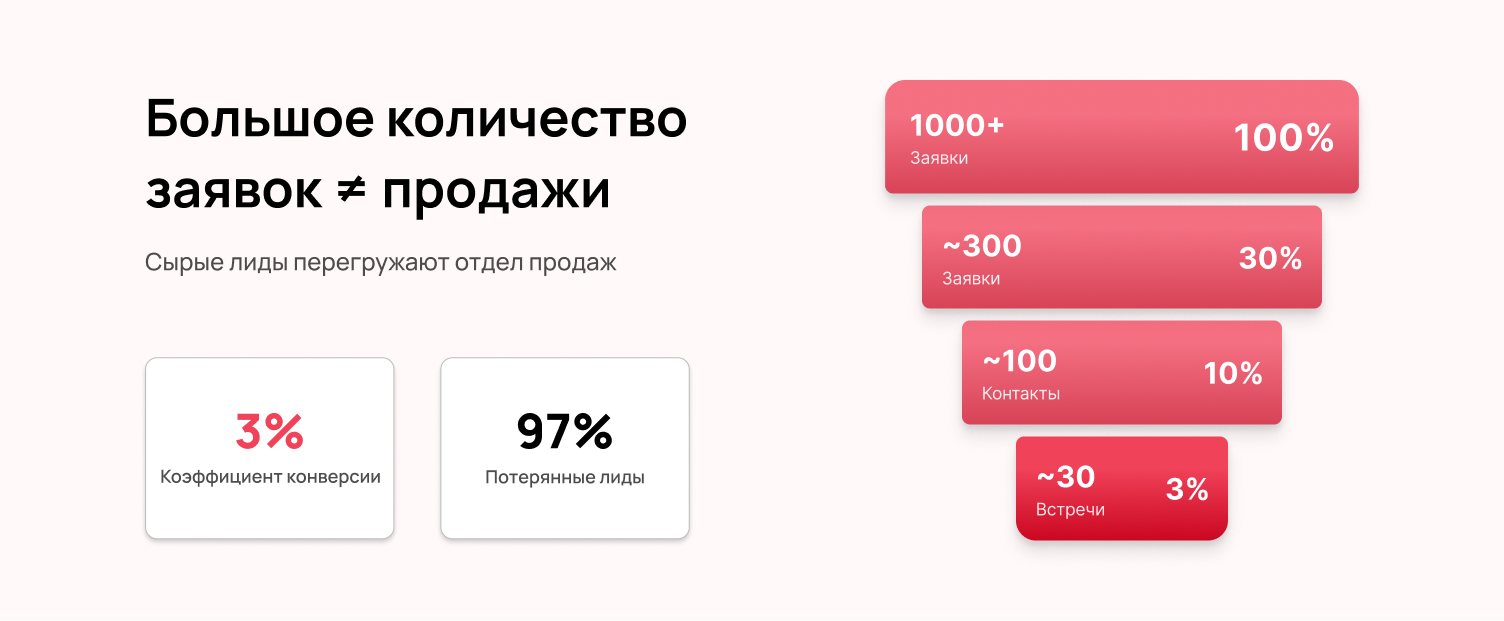 Вместо переговоров менеджеры вручную отсеивают нецелевые обращения, уточняют базовые вещи и тратят время на контакты, которые еще не готовы к предметному разговору.