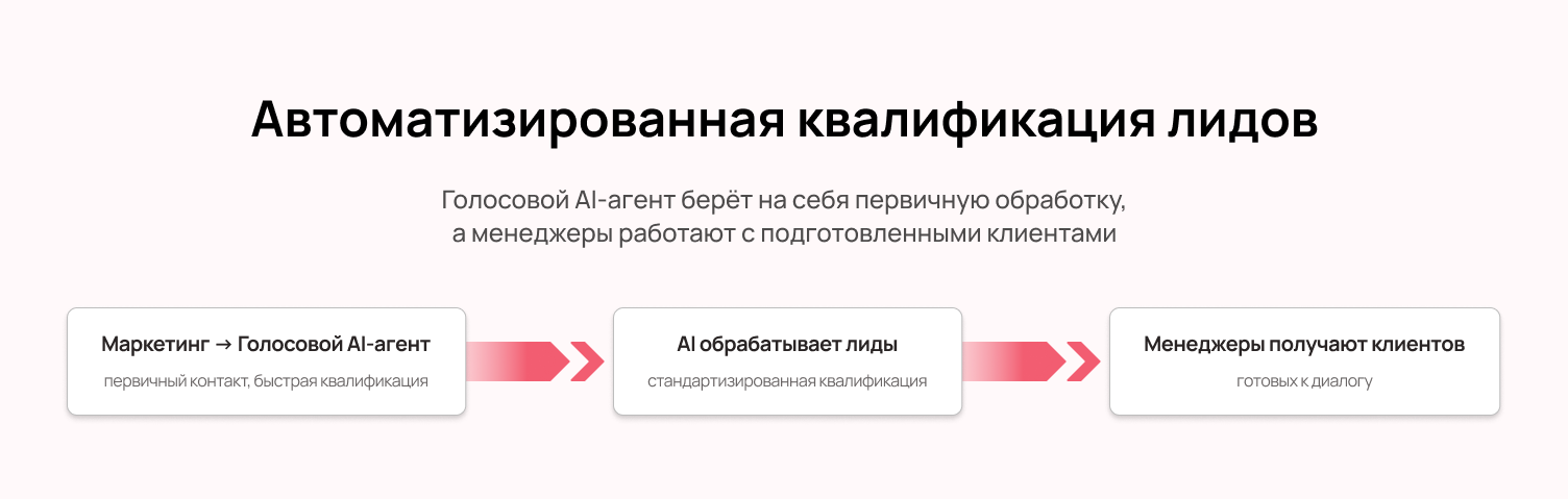 Вынести квалификацию в отдельный управляемый процесс помогает Голосовой AI-агент UniTalk. По сути, AI-агент берет на себя весь первый уровень работы с лидами, то есть тот, который абсолютно не масштабируется вручную.