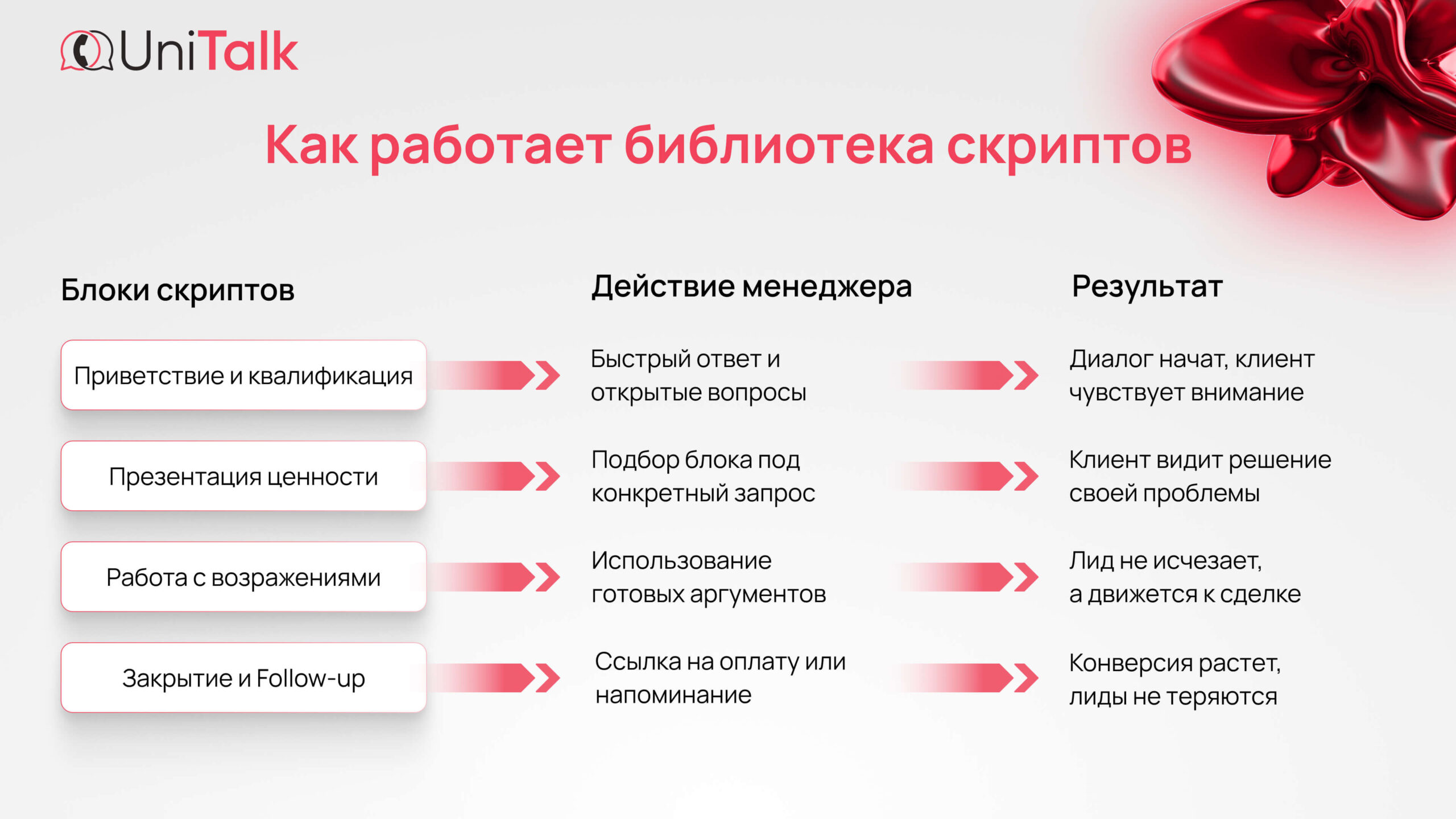 - Скрипты позволяют даже новичку успешно обрабатывать лиды с первого дня.