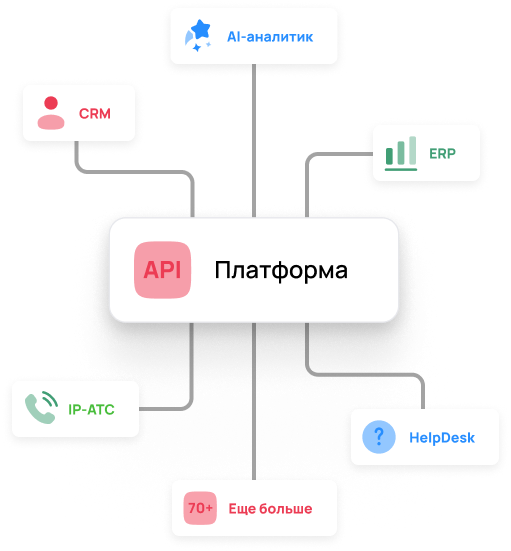 Совместимость с IP-АТС, CRM, ERP, HelpDesk и AI-аналитикой через REST / Webhook API — легко вписывается в вашу ІТ-архитектуру. Всего более 50 готовых интеграций