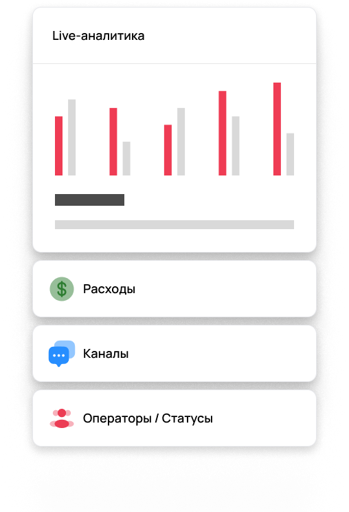 Live-аналитика, расходы, каналы, статусы операторов — все в одном интуитивном кабинете без лишних интеграций