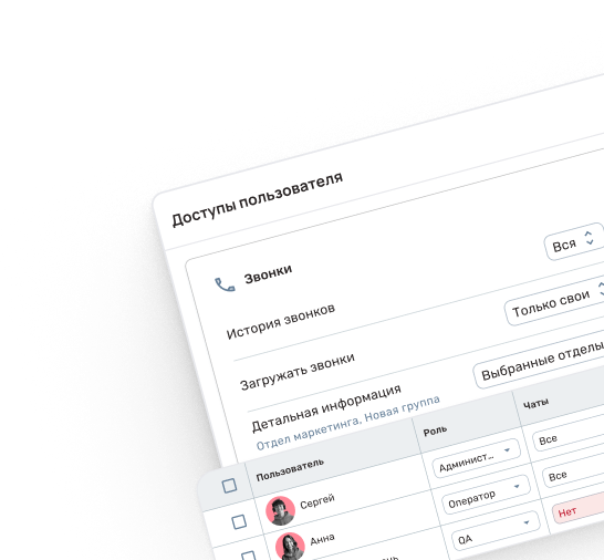 Полностью контролируйте доступы ваших сотрудников. Гибкое распределение ролей гарантирует, что операторы и менеджеры видят только ту информацию, которая необходима для их работы. Максимальная безопасность и ничего лишнего