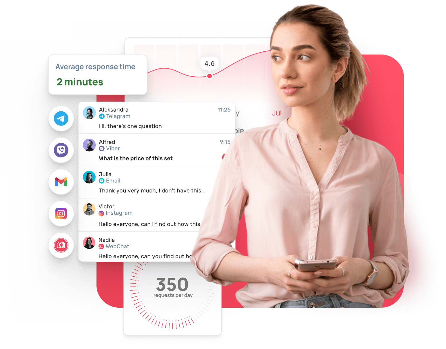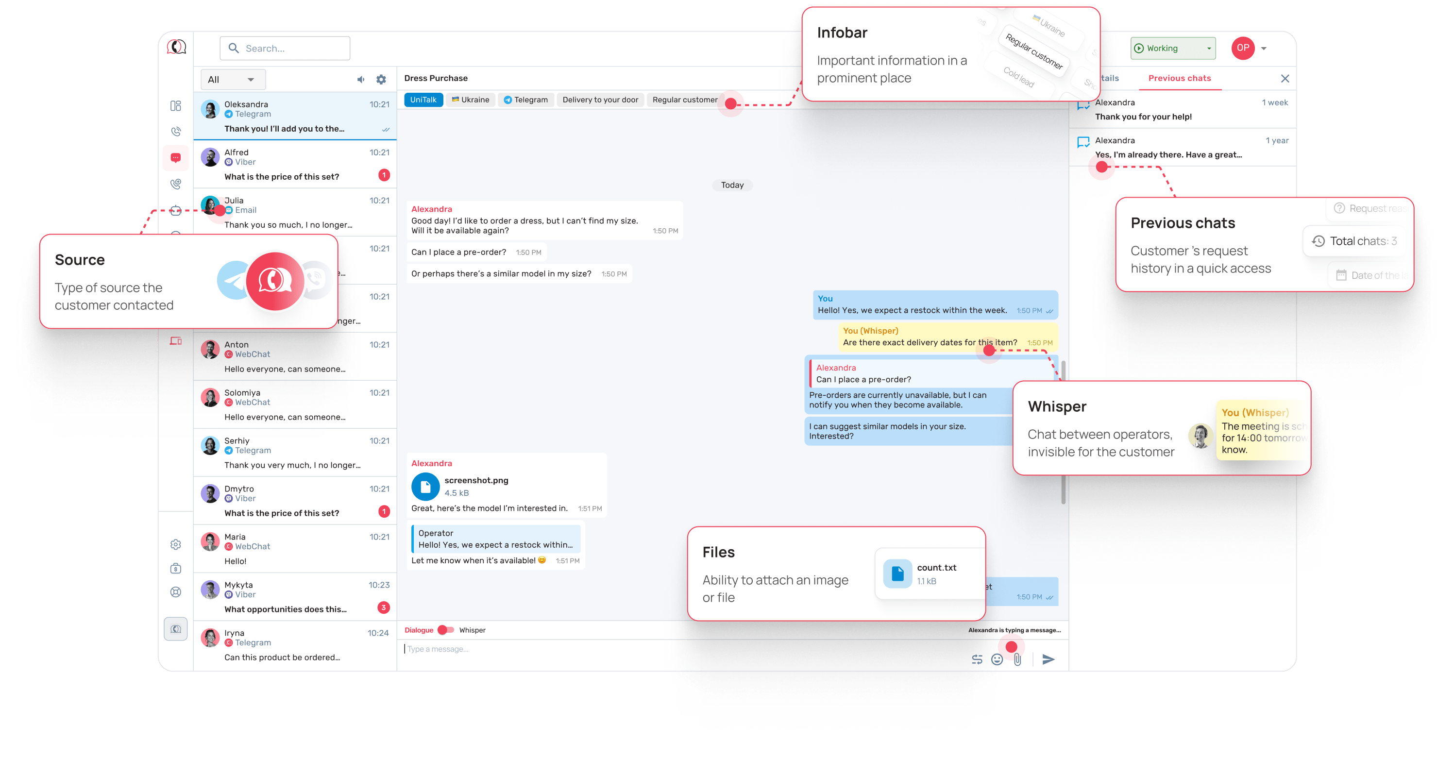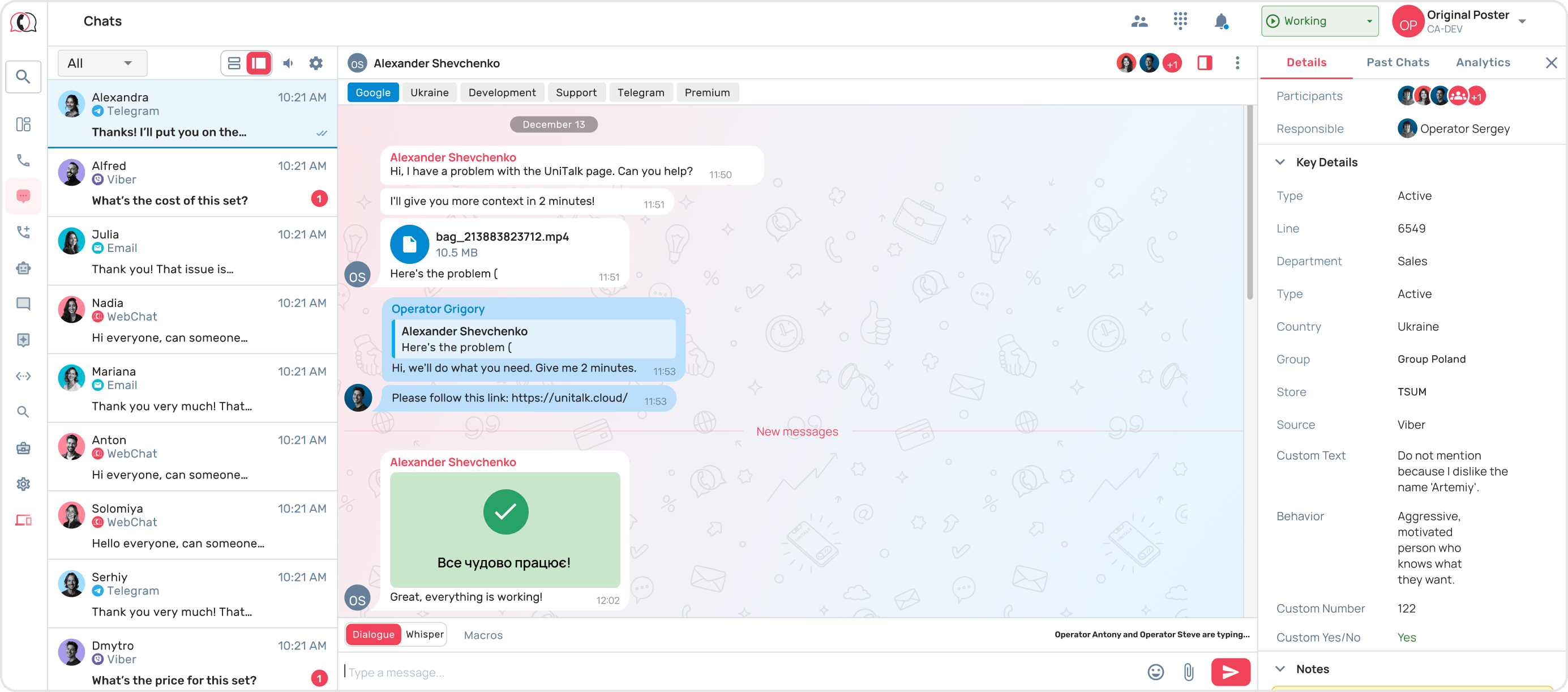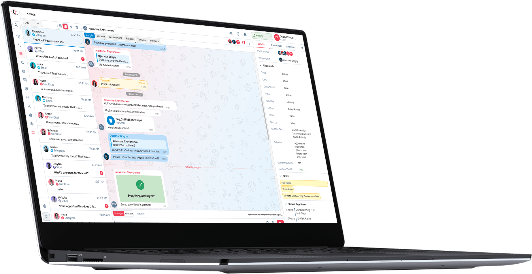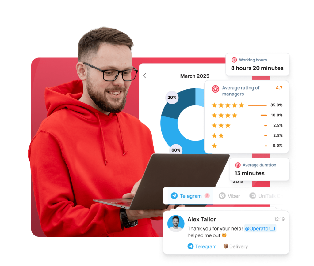 UniTalk Chat is a combination of all text communication channels with customers, which helps businesses efficiently process requests from any platform without losing a single request and providing a high level of service.