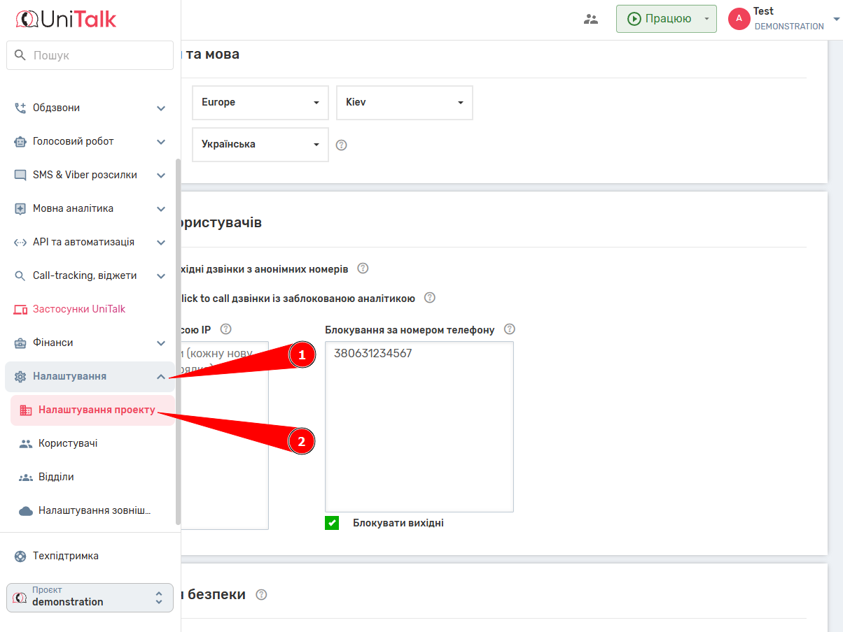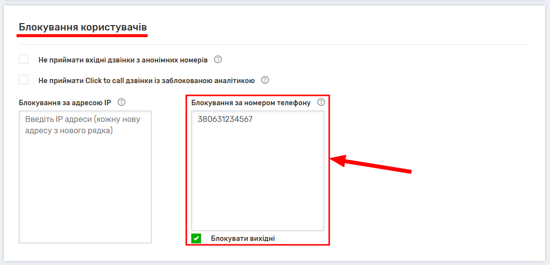 - Знайдіть поле “Блокування за номером телефону” та внесіть туди номери, які потрібно заблокувати.