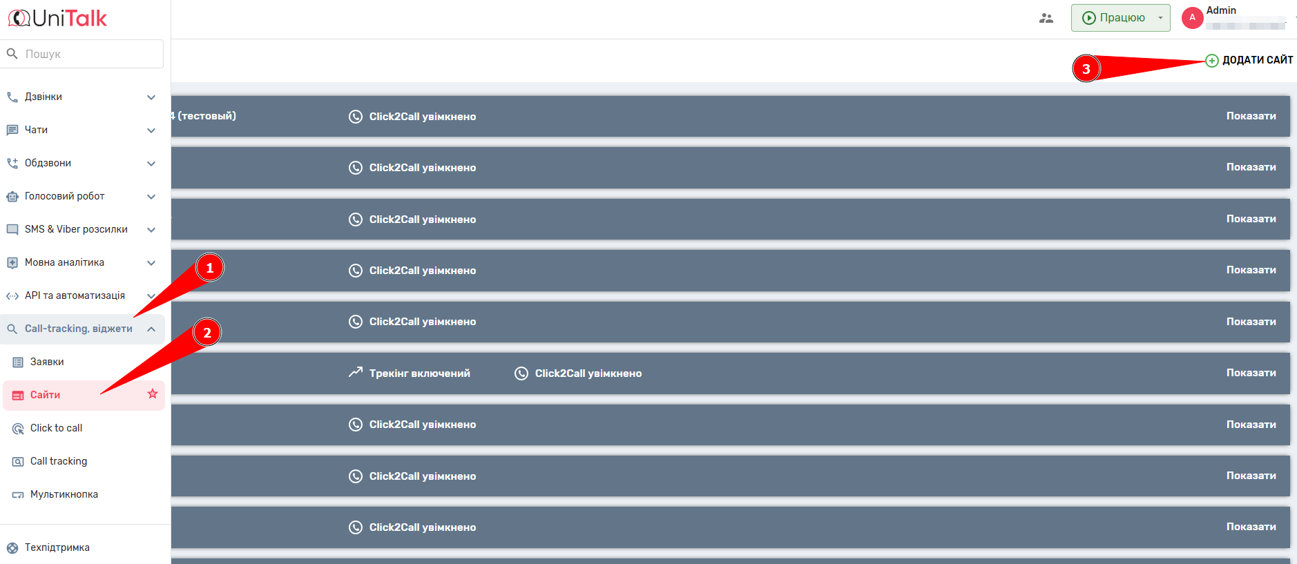 1. Перейдіть до розділу Call-tracking, віджети – Сайти кабінету UniTalk і натисніть “Додати сайт”.