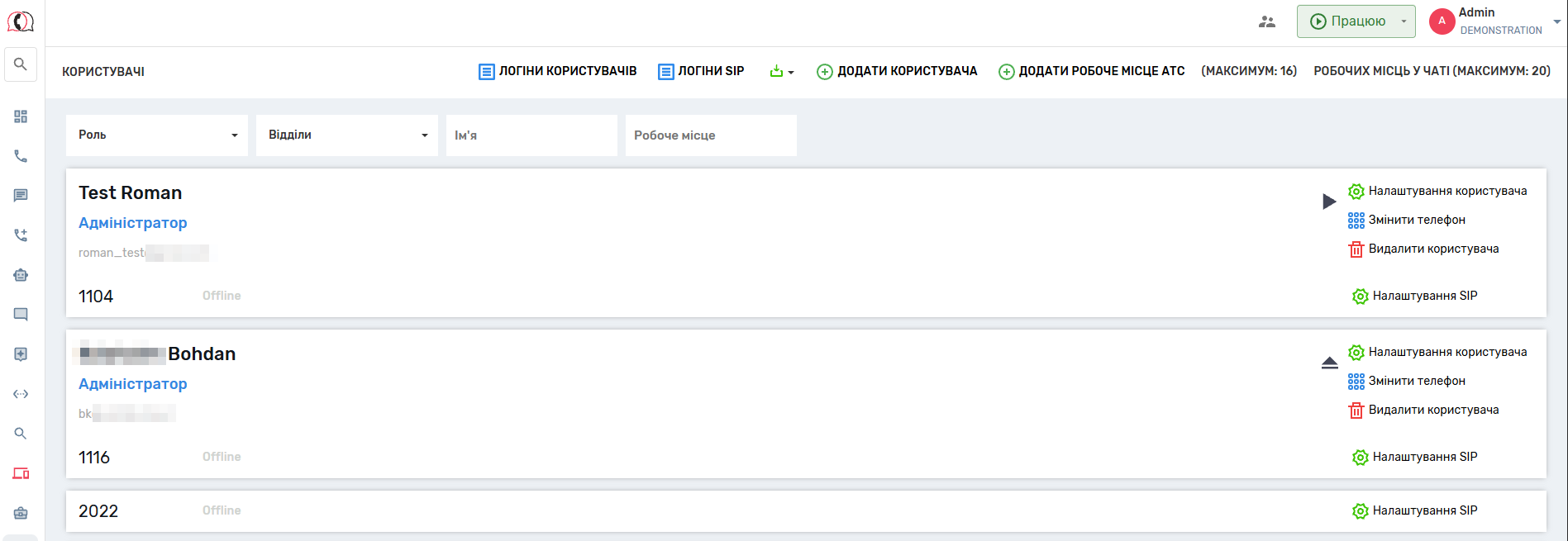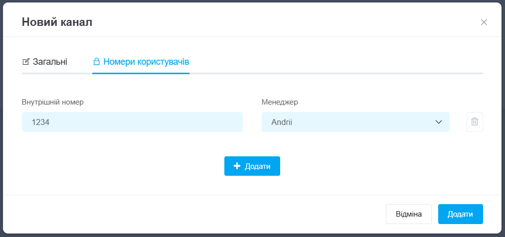 3. Створіть номери внутрішніх ліній UniTalk для кожного менеджера з продажу. Для цього перейдіть до особистого кабінету UniTalk → Налаштування → Користувачі → додайте потрібну кількість ліній.