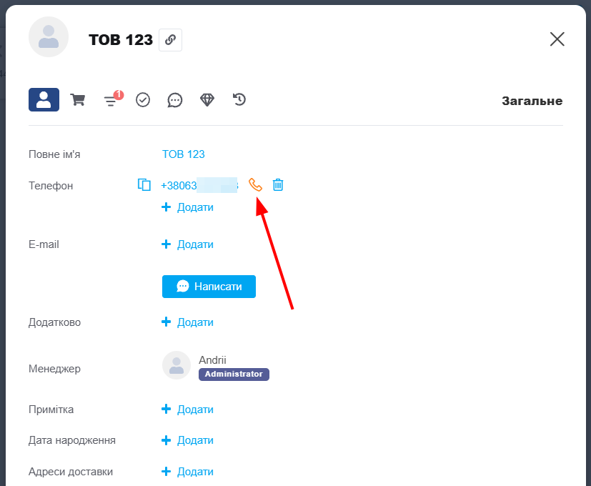При оформленні замовлення клієнт залишає номер телефону, який зберігається у картці замовлення та у картці клієнта в KeyCRM. Для вихідного дзвінка достатньо натиснути на трубку біля номера.