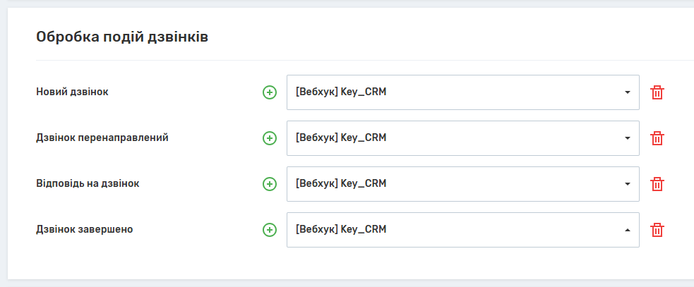7. Після збереження, необхідно перейти на вкладку «API та автоматизація» – «API», та додати обробник подій для кожної події дзвінку. Це робиться шляхом натискання іконки “+” та подальшого вибору раніше створеного обробника подій. Після додавання сторінку необхідно зберегти.