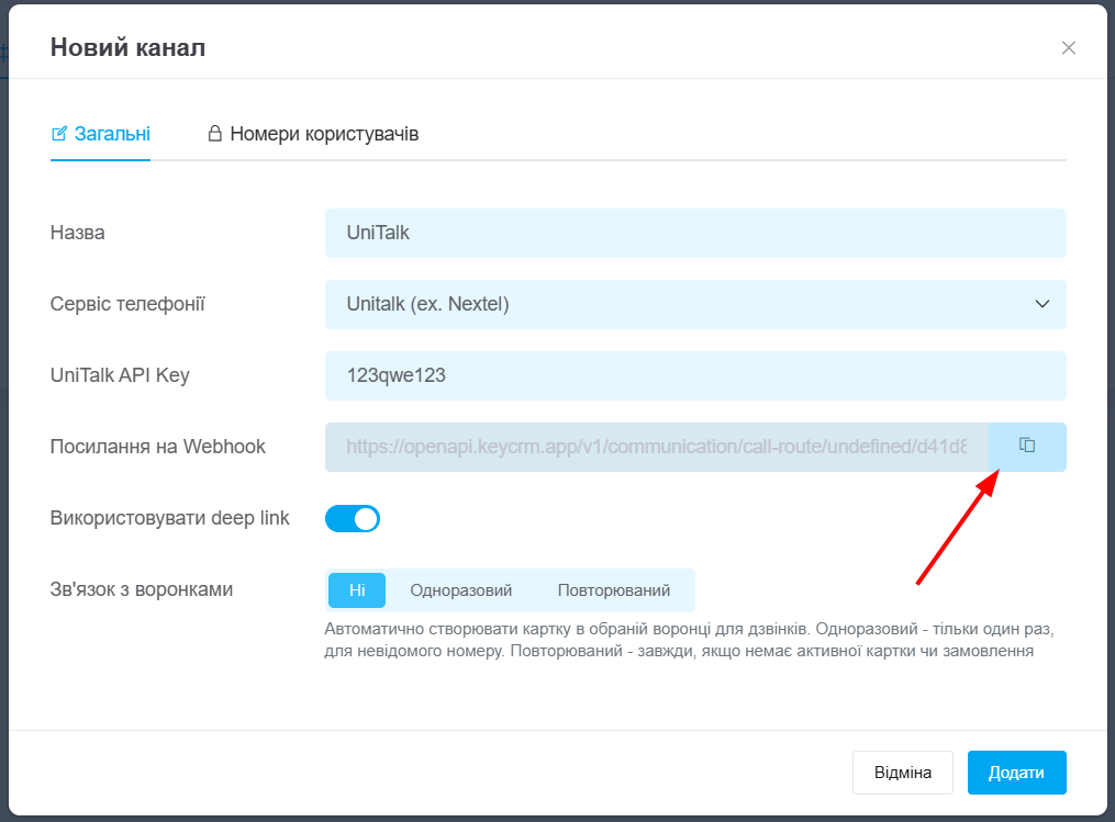 5. Налаштуйте вебхук у UniTalk. Для цього зайдіть в налаштування вже підключеної телефонії та скопіюйте посилання на Webhook.