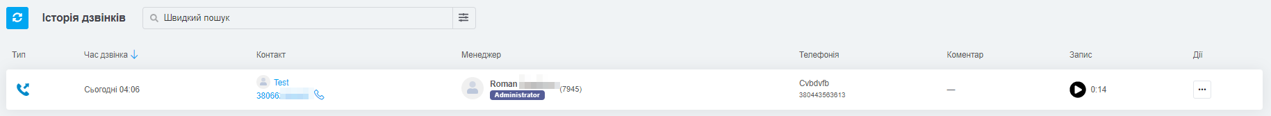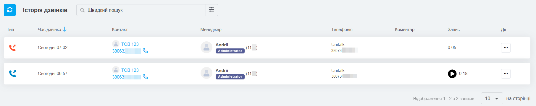 Для обробки вхідних дзвінків слід відповісти на дзвінок. При цьому в KeyCRM з’явиться запис про дзвінок: з часом дзвінка, тривалістю, номером телефону та іншою інформацією.