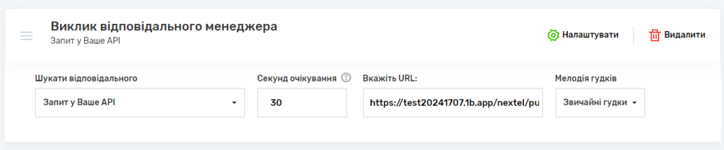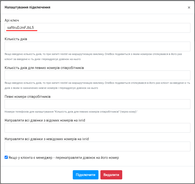 Вказуємо наш API-ключ, також додатково можемо провести налаштування з пошуку відповідальних співробітників і під час дзвінків.