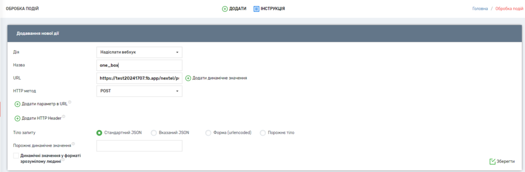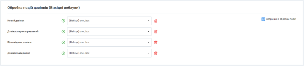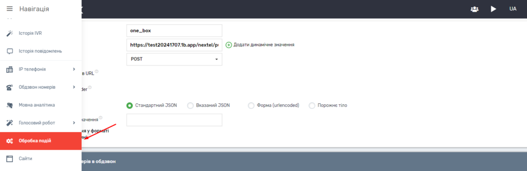 Далі переходимо до налаштування веб-хука для передання інформації про дзвінки в CRM-систему. Для цього в особистому кабінеті переходимо в розділ “обробка подій”