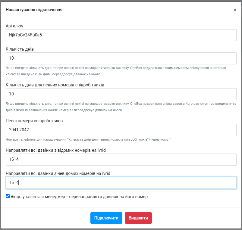 - Якщо не спрацювали попередні пункти і заповнені налаштування “Кількість днів”, то OneBox буде шукати останній дзвінок із зазначеного номера за вказану кількість днів і дивитися, з яким номером був з’єднаний клієнт. Якщо є номер, то він буде переданий телефонії для маршрутизації дзвінка.