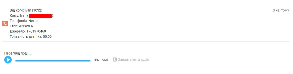 Переглянути список дзвінків і прослухати аудіо записи розмов Ви можете в пункті меню “Події” в особистому кабінеті OneBox або прямо в контактній картці.
