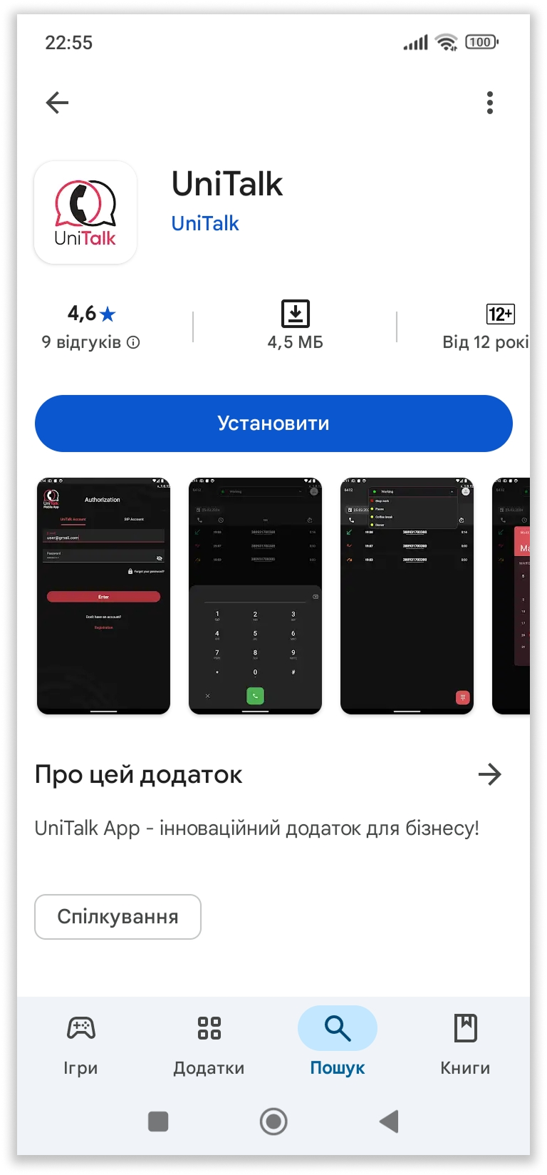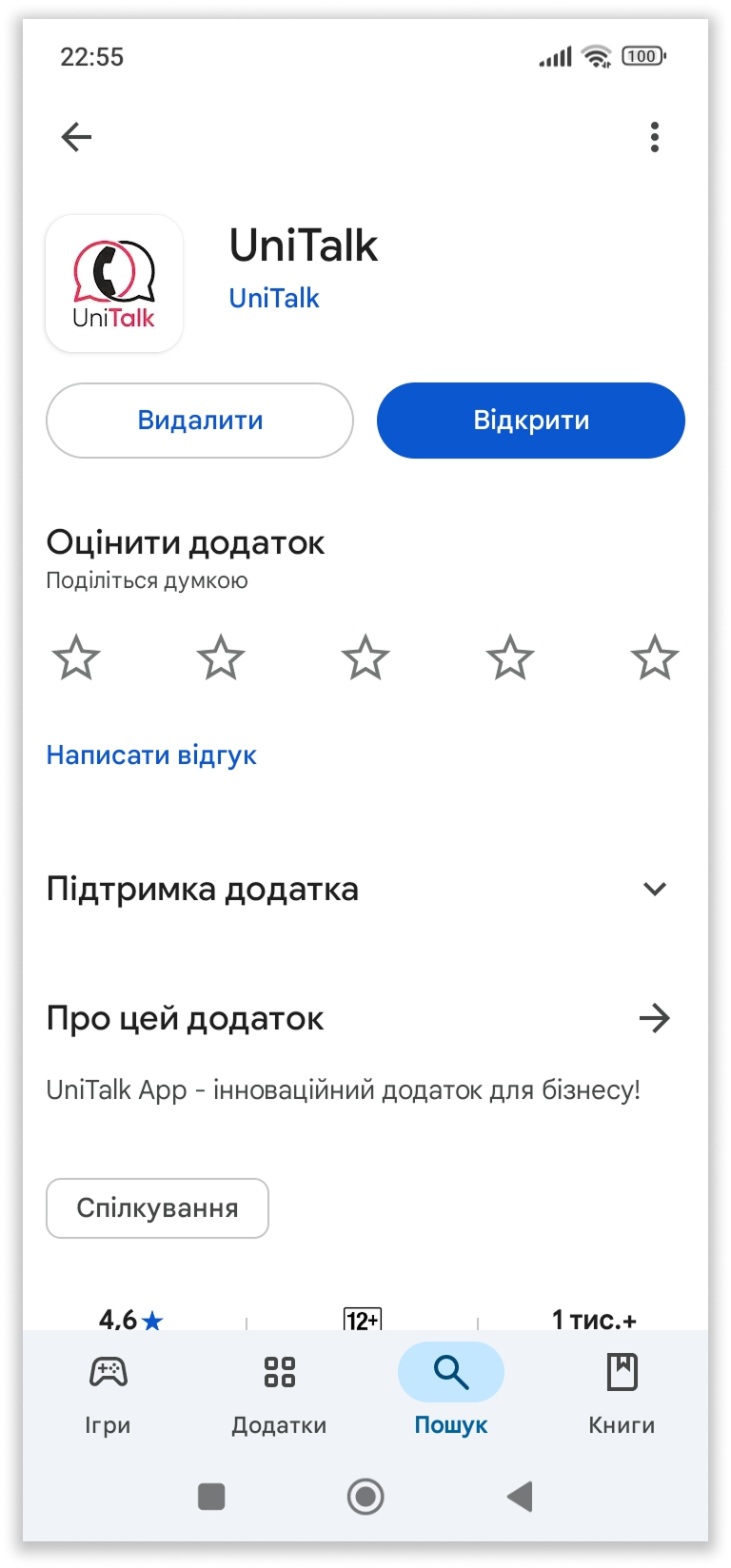 Щоб завантажити додаток UniTalk на ваш смартфон, перейдіть за посиланням у Google Play та натисніть “Установити”. Після завантаження застосунку потрібно натиснути “Відкрити”:
