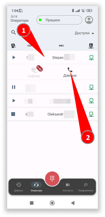 У розділі “Оператори” відображаються інші користувачі проекту, чиє робоче місце АТС є в статусі “Online”, тобто SIP-лінія зареєстрована. При натисненні на одного з користувачів, є можливість зателефонувати йому: