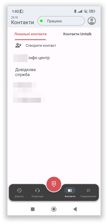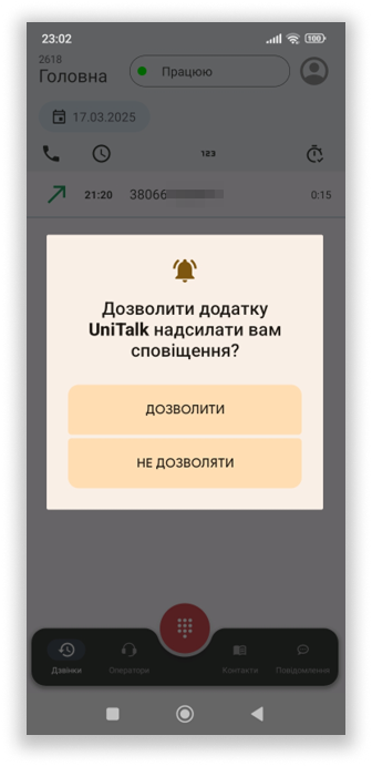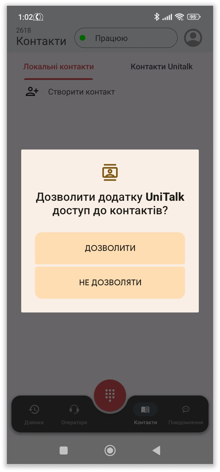 У розділі “Контакти” є можливість працювати з телефонною книгою як локального пристрою, так і з контактами, що є у проекті в системі UniTalk. Для доступу до локальних контактів необхідно надати дозвіл додатку: