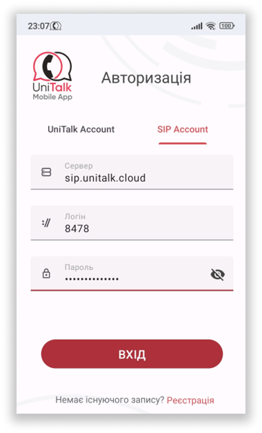 Авторизація у додатку “UniTalk Mobile App” доступна із використанням даних від особистого кабінету UniTalk вашого проєкту. Однак, для цього за вашим обліковим записом у проєкті повинна бути закріплена робоча SIP-лінія.