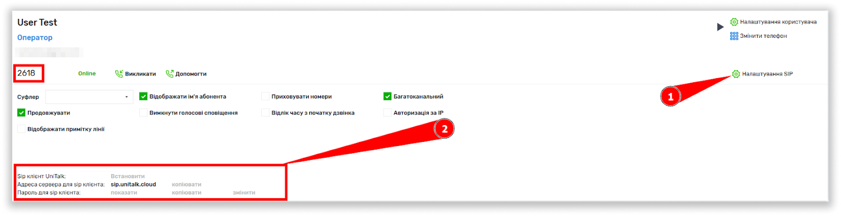 Знайти ці дані можна в особистому кабінеті UniTalk вашого проєкту, у розділі “Користувачі”. Перейдіть у розділ Налаштування SIP, та скопіюйте дані від робочої лінії:
