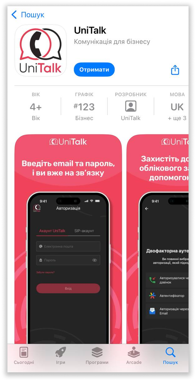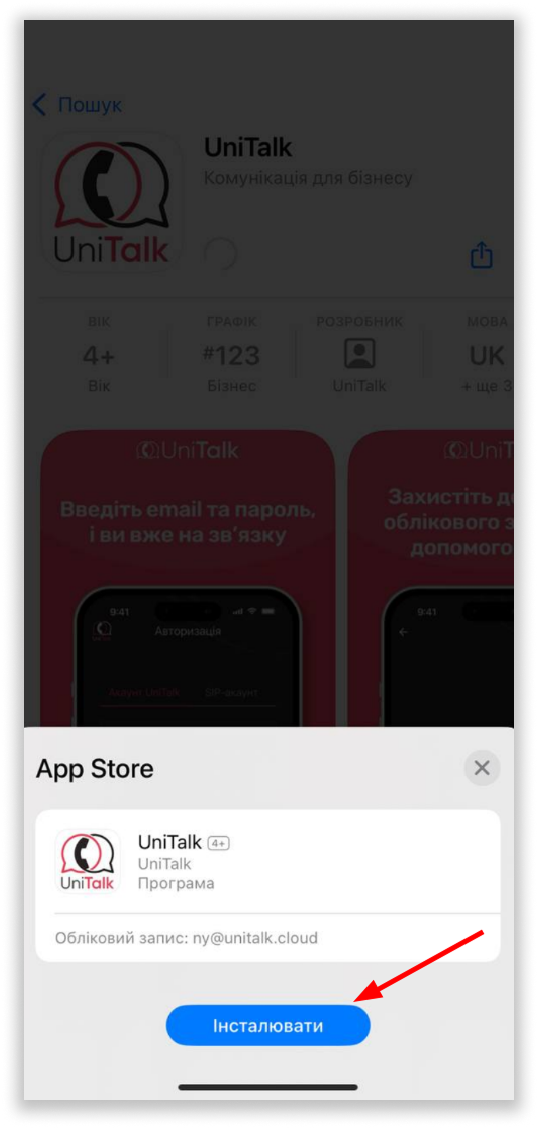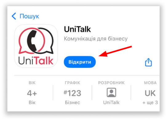 Щоб завантажити додаток UniTalk на ваш смартфон, перейдіть за посиланням у App Store. Натисніть “Отримати”, а потім підтвердьте встановлення, обравши “Інсталювати”.
