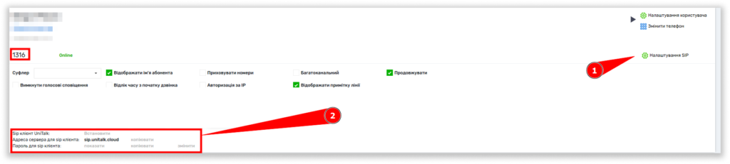 Знайти ці дані можна в особистому кабінеті UniTalk вашого проєкту, у розділі “Користувачі”. Перейдіть у розділ Налаштування SIP, та скопіюйте дані від робочої лінії: