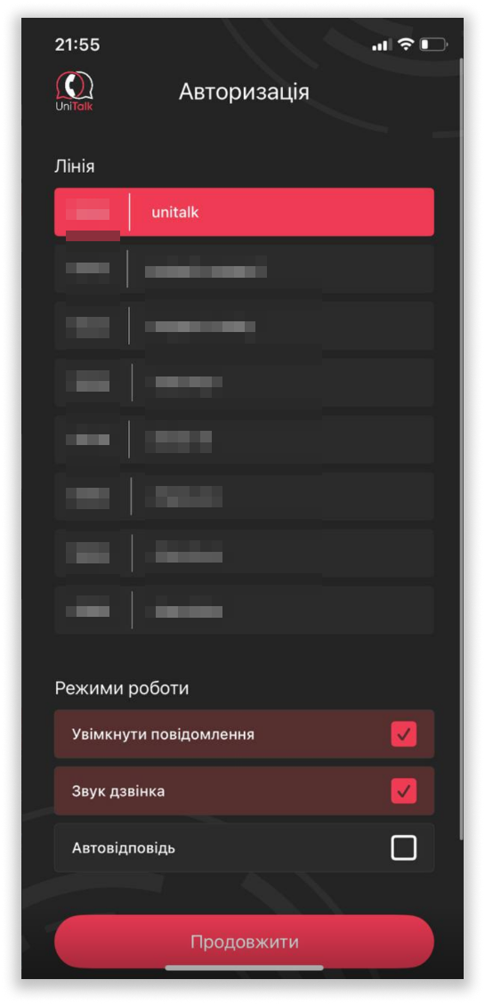 Також, авторизуватись у застосунку можна за допомогою даних від робочої лінії. У такому разі нема потреби, щоб лінія була закріплена за користувачем проєкту UniTalk.