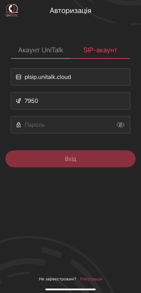 Авторизація у додатку “UniTalk Mobile App” доступна із використанням даних від особистого кабінету UniTalk вашого проєкту. Однак, для цього за вашим обліковим записом у проєкті повинна бути закріплена робоча SIP-лінія.