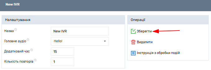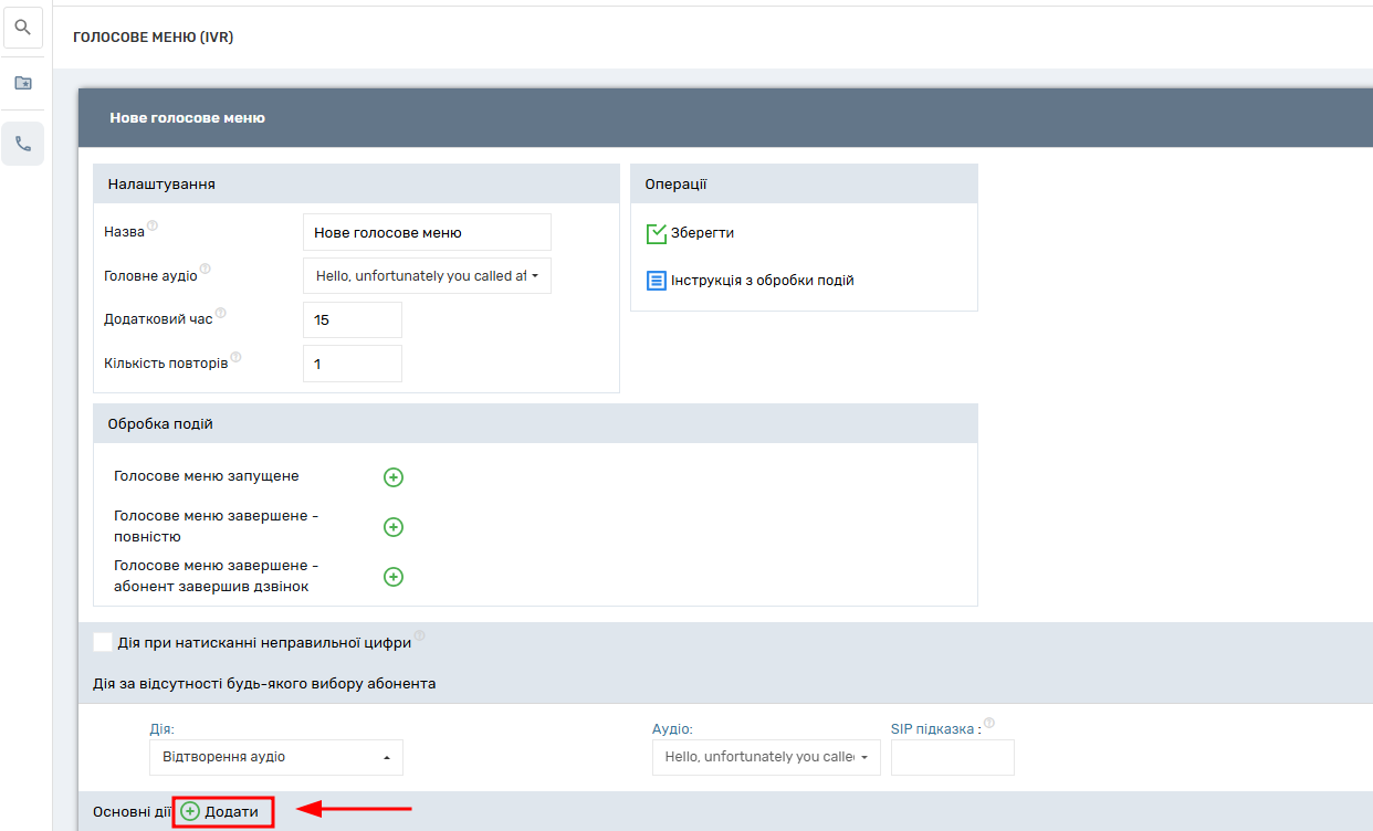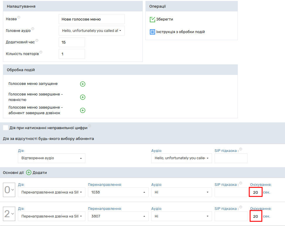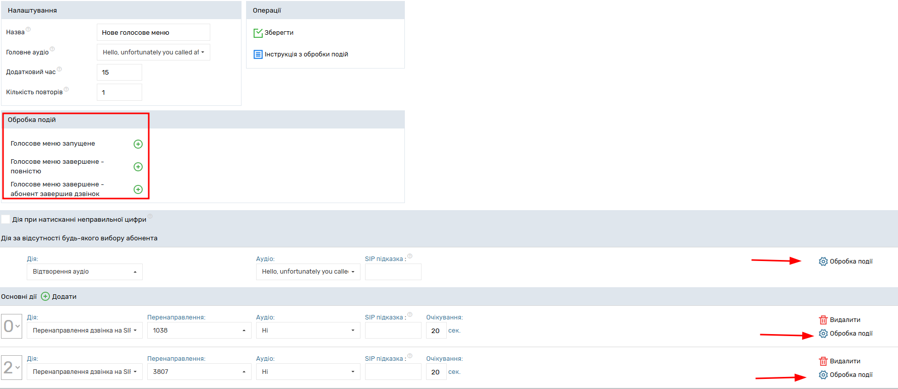 Хочемо звернути увагу, що функціонал голосового меню можна розширити встановивши обробники подій на будь-яку подію. Ознайомитись з інструкцією обробки подій можна не виходячи з самого голосового меню: